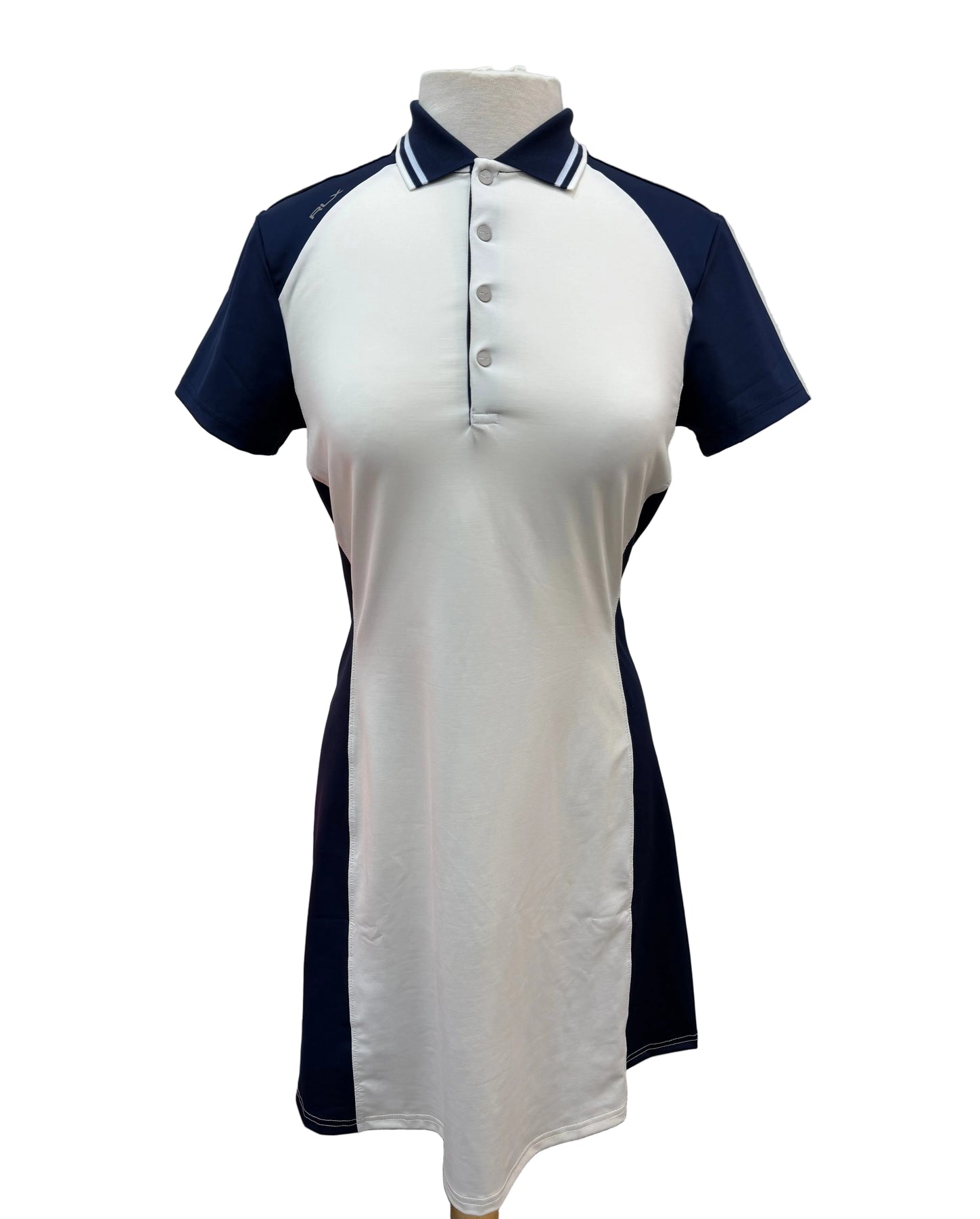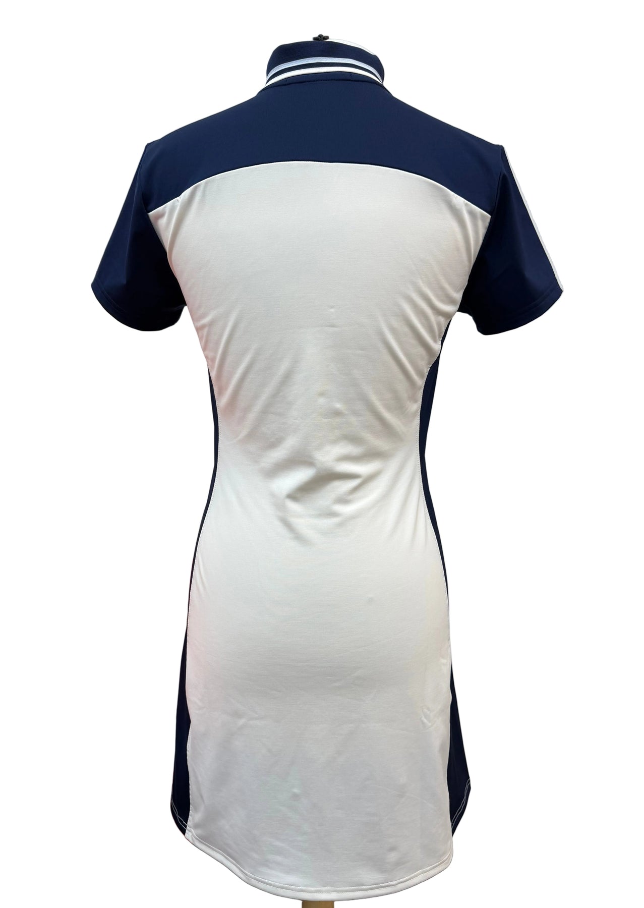 Step up your golf game with this color-blocked stretch jersey polo dress that keeps you looking sharp and feeling fantastic. The elite wicking fabric pulls moisture away, so you stay cool and dry whether you're sinking putts or soaking up the sun. White and navy styling adds a timeless touch that works both on and off the fairway.
