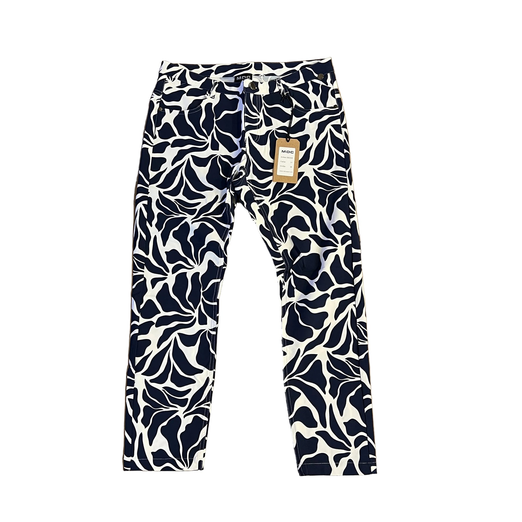 These low-rise printed cropped golf pants are designed with 4-way stretch for unrestricted movement and all-day comfort. Made from a high-performance blend of 90% polyamide and 10% elastane, they feature moisture management and built-in U.V. protection to keep you cool and protected on the course. The pants measure 84 cm (33") in side length with a 64 cm (25") inseam, based on EU size 36 / US size 4, and are finished with sleek gunmetal accessories. Expertly made in Europe for premium quality and performance.