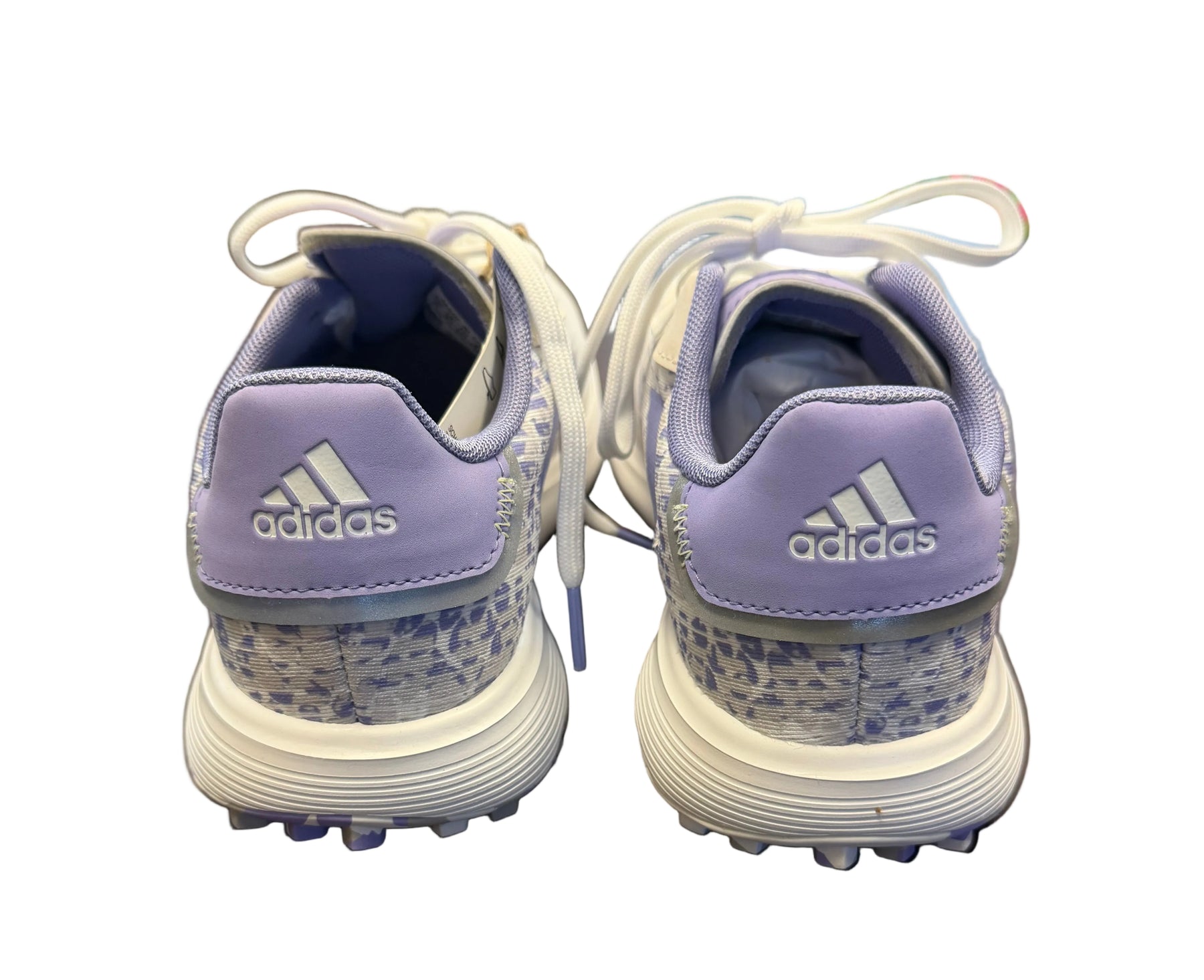 Step up your golf game with style in these Adidas Women's Spikeless Golf Shoes. The crisp white leather pairs perfectly with a bold purple logo for a look that's as fun as it is functional. Spikeless soles deliver comfort and traction on every swing, while the sleek design transitions seamlessly from the course to casual wear. Whether you're a seasoned golfer or just starting out, these kicks bring the perfect blend of performance and personality to your round.