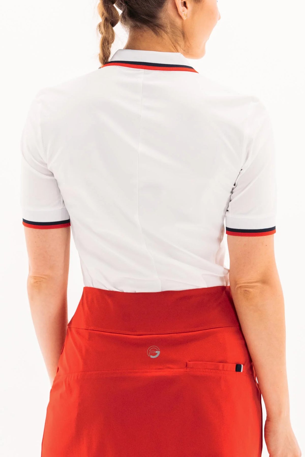 Italian technical jersey short sleeve button front polo, with flattering princess seams, tri-color rib knit collar, and underarm gusseting to add movement. Breathable, 4-way stretch, wicking, and UPF 50+ sun protection.