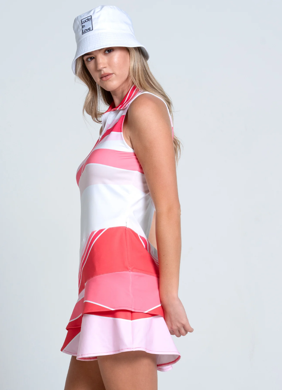 Experience effortless elegance with the Lucky In Love Sleeveless Dress from the Summer Crush collection. Crafted from breathable, stretchy fabric that moves with your body, this sophisticated design features a refined zip-up collar and sleeveless silhouette. The thoughtfully seperate under shorts provide discreet coverage and confidence for active wear, ensuring both style and practicality in one exquisite garment.