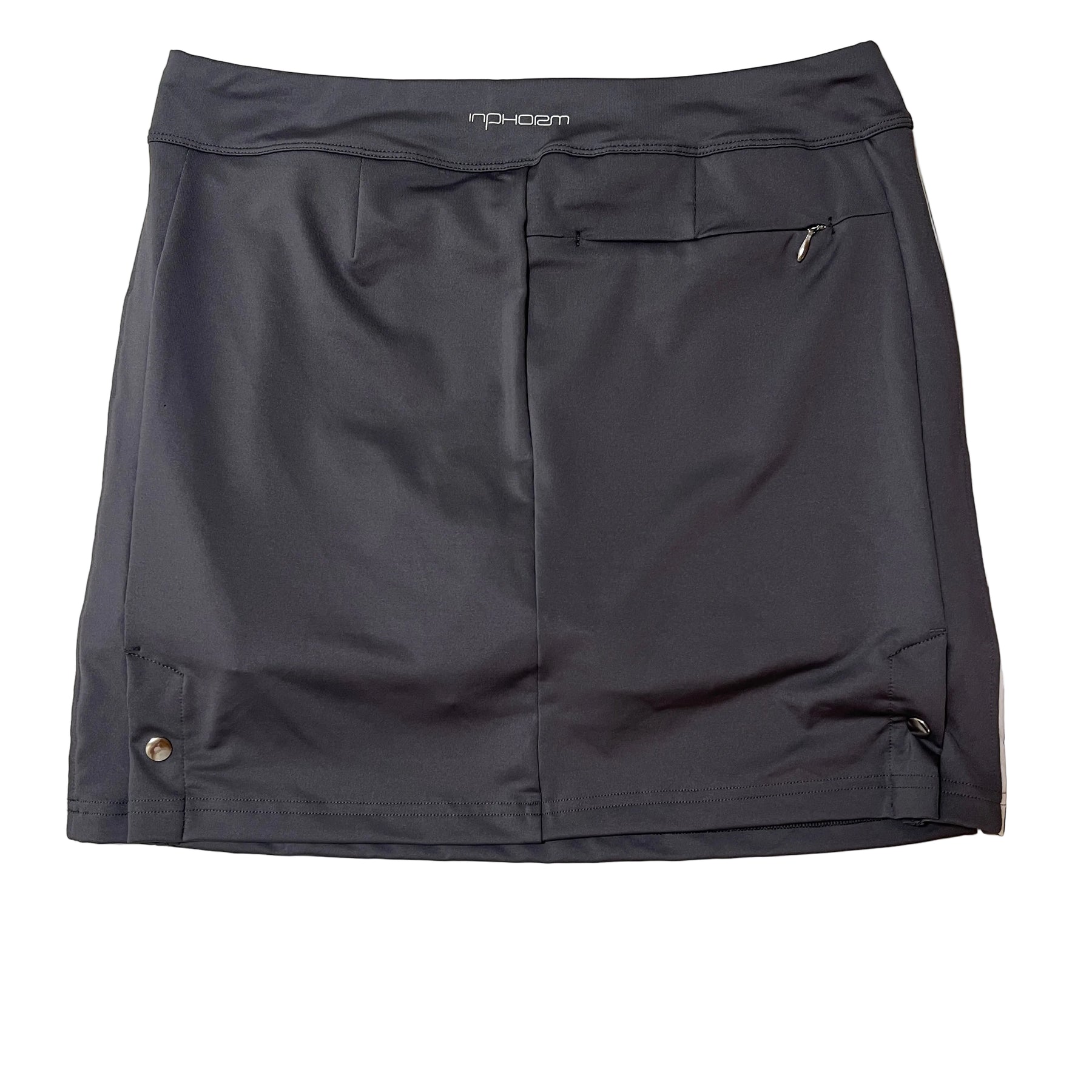 Women's 15" Golf Skirt - This skirt is made with moisture-wicking fabric that offers good stretch and a full range of motion while playing. It features two front pockets and a zip back pocket that allows you to keep your scorecard secured. It also has metal snap button clasps on the back that can be unfastened for additional movement.